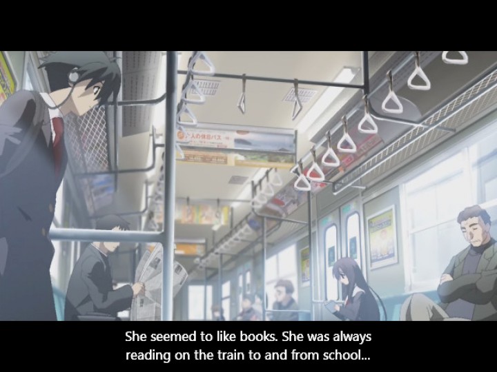 主人公『伊藤诚(いとう まこと)』已经有了心上人,并偷偷地把那个女孩子的照片作为手机的待机图片一直带在身边。她就是隔壁班级的『桂 言叶(かつら ことのは)』。她一直与诚经过同样的铁路沿线,乘坐同一时刻的电车,因而诚渐渐地喜欢上了她。所以每天的上学、放学时间成了诚的唯一乐趣。