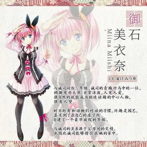 | 御石 美衣奈 与诚司同为三年级,诚司的青梅竹马中的一位。稍微有些天然,非常活泼,人见人爱,很自然的就能成为制造话题的中心人物,很有人望。时不时有和动物们对话的习惯,兴趣是园艺,甚至到了在自己的房子内自建了一个豪华庭院的等级。与诚司的关系源于父母间的交情,也因此诚司能够借住在她的家中。 | |