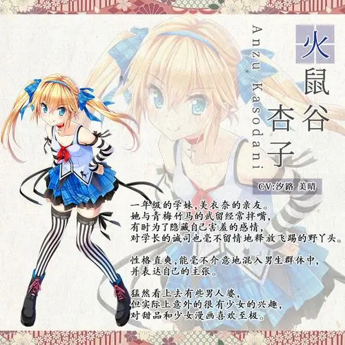 | 火鼠谷 杏子 一年级的学妹,美衣奈的亲友。她与青梅竹马的武留经常拌嘴,有时为了隐藏自己害羞的感情,对学长的诚司也毫不留情地释放飞踢的野丫头。性格直爽,能毫不介意地混入男生群体中,并表达自己的主张。猛然看上去有些男人婆,但实际上意外的很有少女的兴趣,对甜品和少女漫画喜欢至极。 | |