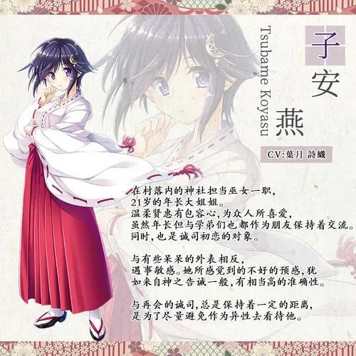 | 子安 燕 在村落内的神社担当巫女一职,21岁的年长大姐姐。温柔贤惠有包容心,为众人所喜爱,虽然年长但与学弟们也都作为朋友保持着交流。同时,也是诚司初恋的对象。与有些呆呆的外表相反,遇事敏感。她所感觉到的不好的预感,犹如来自神之告诫一般,有相当高的准确性。与再会的诚司,总是保持着一定的距离,是为了尽量避免作为异性去看待他。 | |