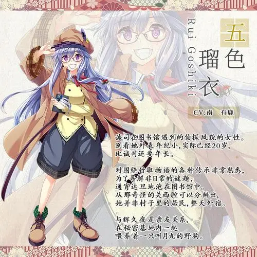 | 五色 瑠衣 诚司在图书馆遇到的侦探风貌的女性。别看她外表年纪小,实际已经20岁,比诚司还要年长。对围绕竹取物语的各种传承非常熟悉,为了寻解非日常的谜题,通宵达旦地泡在图书馆中。从那奇怪的关西腔可以分辨出,她并非村子里的居民,整天外宿。与辉久夜是亲友关系,在秘密基地内一起喂养着一只叫月丸的野狗。 | |