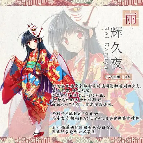 | 丽辉久夜 时隔数年再次来访村庄的诚司最初遇到的少女,天真烂漫,纯洁无垢。虽然身着不便于活动的和服,但却意外的运动神经很好。管诚司叫“哥哥”,非常仰慕诚司。与村子内流传的“辉夜姬”名字发音相同(KAGUYA),真实身份非常神秘。肚子饿着的时候被美衣奈投食,至此经常跑到御石家玩。 | |