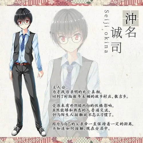 | 冲名诚司 主人公。为寻找母亲明的死亡真相,回到了时隔数年未顾的故乡村庄,散吉乡。受原来有些阴暗内向的性格影响,虽然能够和熟悉的人普通交流,但与陌生人接触就不怎么习惯了。因为与自己的父亲帝一直保持着一定的距离,不知道如何接触,现在分居中 |