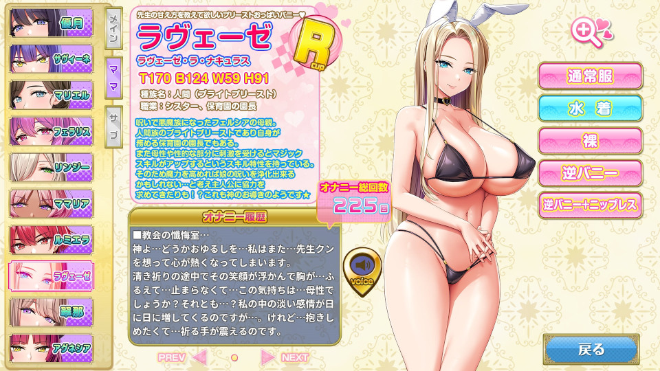 剧情简介 主人公炎条寺 炎輝(えんじょうじ ほむら)は兎咲学園(うさき がくえん)に通う 2 年生。 おっぱいとバニーガール好きな主人公は自身が部長をつとめる「アプリ開発部」 「おっぱいバニー学園」というエロゲーもとい美少女ゲームをマスターアップに向け極秘に開発していた。 (表向きは健全な部活動を装っているがペーパー部活動であり実態は「美少女ゲーム開発部」) しかし、兎咲学園の授業参観当日、デバッグ中に突然、 部にきていた幼馴染、部員と参観日にきていた母親達と共に 開発していたエロゲーの異世界に転移してしまう! 転移した先は生徒や先生、学園理事長までもがナイス爆乳+‘全員バニーガール’という まさに下半身がぴょんぴょんしてしまうようなバニーガール学園だった! 転移は学園側が行った召喚であることが判明。主人公は‘伝説の大いなる先生’として バニー偏差値が低下し廃校の危機に瀕している学園を救わなければならなかった! 主人公をスキルサーチしても能力を感じ取ることが出来なかった理事長は主人公をテストすることに。 その時、‘ドスケベ教育スキル’が発動! 理事長のドスケベボディを‘教育’することに性交!もとい成功! さらに中出しした精液で理事長のスキル・バニー偏差値も上昇していることが判明! 爆乳揃いのバニー達とその母親達を見るうちに何故か沸々と下半身に沸き上がるドスケベな野望。 この‘ドスケベ教育スキル’があれば学園……否、異世界を征服 or 性服することが出来るのでは? 異世界の学園ドスケベ性服、母娘性服の野望を下半身にたぎらせる主人公。 「このおっぱいバニー学園の生徒と母親達を‘ドスケベ教育’してやるぜっ!」 主人公のおっぱいバニー学園性服の野望が始まる!