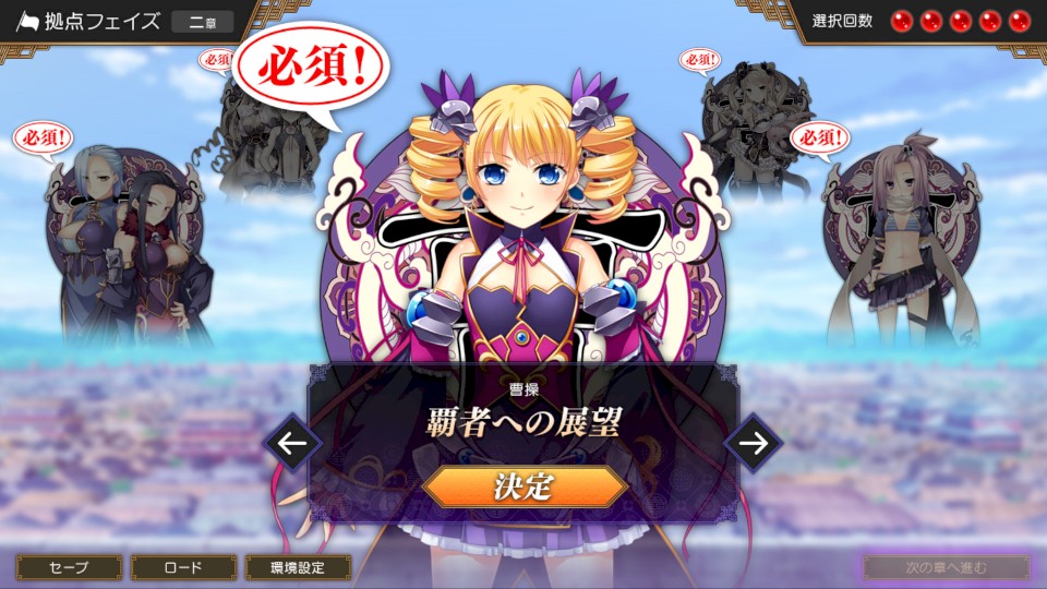 人物介绍: 曹操 (そうそう)・【華琳 (かりん)】 武艺・统治・诗・料理都造诣深厚的完美超人。 但是并不满足于此,一直在探寻着比自己还要强力的超一流人才。 是个有着极强自尊心的自信家,在皇权威信丧失的这个乱世之中,本着自己是统一乱世之枭雄的信念,而公开举起了革命大旗。 十分痴迷于漂亮的东西,兴趣是网罗天下的美少女。 “我乃天命之子。来吧,和我一起在这乱世中大放异彩吧” 夏侯惇 (かこうとん)・【春蘭 (しゅんらん)】 曹操的表姐,也是夏侯渊的姐姐。 在曹操还是没人追随的无名小卒之时就是其贴身随从,爱人。 死心塌地得侍奉曹操,也是挡在其身前阻碍一切来犯之敌的屏障。 性情中人,有着军人意志的猛士。为了曹操会肝脑涂地。 “我的名字是夏侯元譲!为主公的霸业开路,不论挡路者是谁都一概击倒,我就是孟德公的利剑”